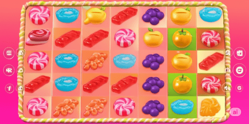 Saat pertama kali membuka game ini, pemain akan langsung disambut dengan latar belakang negeri permen yang fantastis. Awan-awan berbentuk cupcake, sungai cokelat yang mengalir deras, dan perbukitan es krim menciptakan suasana yang ceria dan menyenangkan. Simbol-simbol dalam game ini pun tak kalah menarik, menampilkan berbagai jenis permen jelly dengan warna-warna cerah seperti merah, ungu, hijau, biru, dan kuning, serta buah-buahan segar seperti pisang, anggur, semangka, plum, dan apel. Desain grafis yang detail dan animasi yang halus semakin menambah daya tarik visual game ini, membuat pemain betah berlama-lama menatap layar.